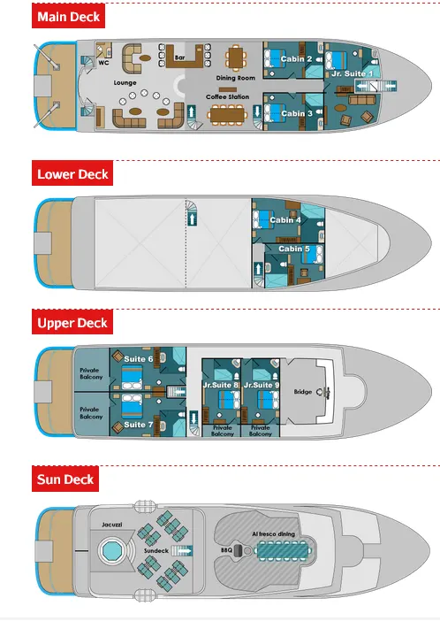 View all decks, cabin positions, entertainment and dining areas on the Natural Paradise deck plans below.