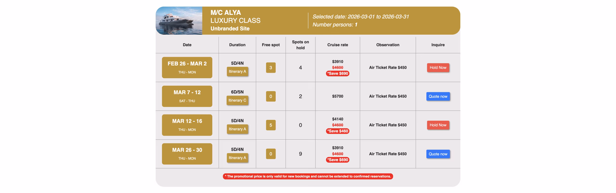 Best-value luxury in its class — Alya offers what many larger ships can’t: a high-end, boutique cruise experience at a more accessible price point. With our 2026 deals, you’ll get top-tier comfort, rich nature encounters and attentive service — all without VIP prices.